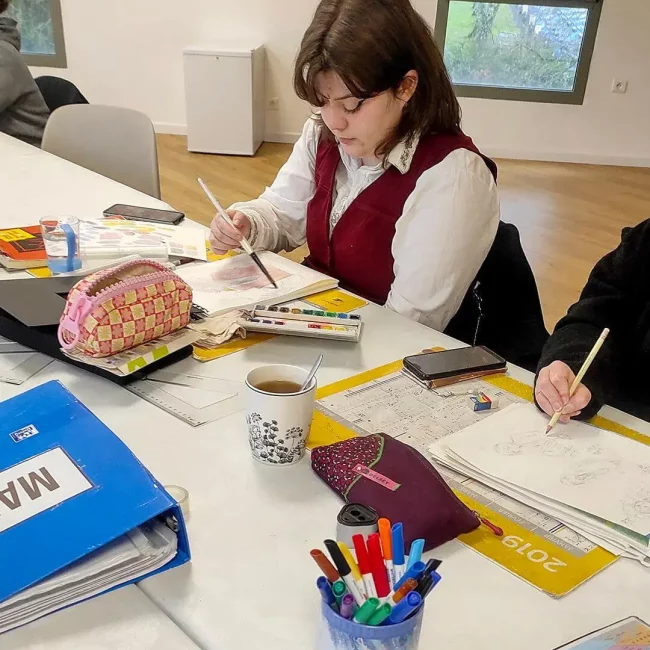 Vivez l’ambiance d’un véritable studio où se croisent passionnés de BD, Manga et Illustration. Cette mixité de projets favorise une émulation collective et une progression riche au contact des autres créatifs car l'ensemble des cours se déroulent en simultanés.